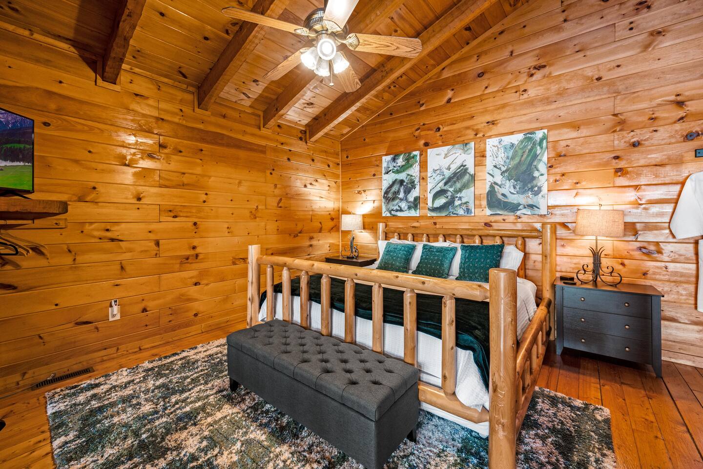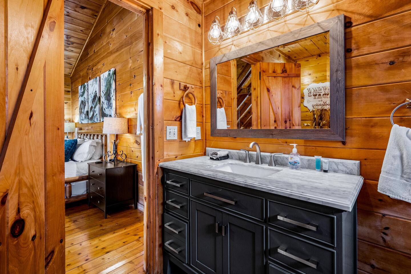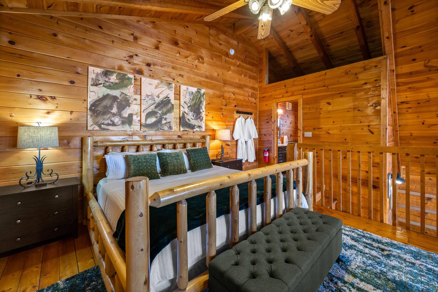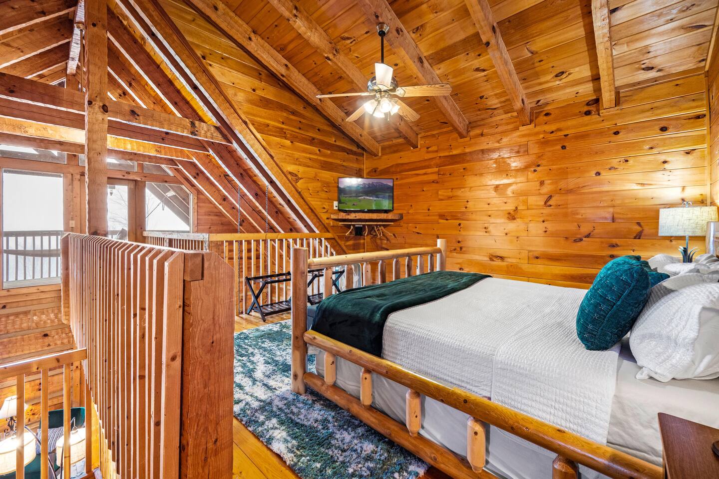 After a day of activities, the upstairs loft bedroom with its comfortable king size bed will lull you into dreamland. The bedroom includes a smart tv and an en-suite bath with a walk-in shower, large vanity, and a soaking tub. The bedroom has a catwalk that overlooks the great room and leads to the deck equipped with glider rocker benches and a hammock.