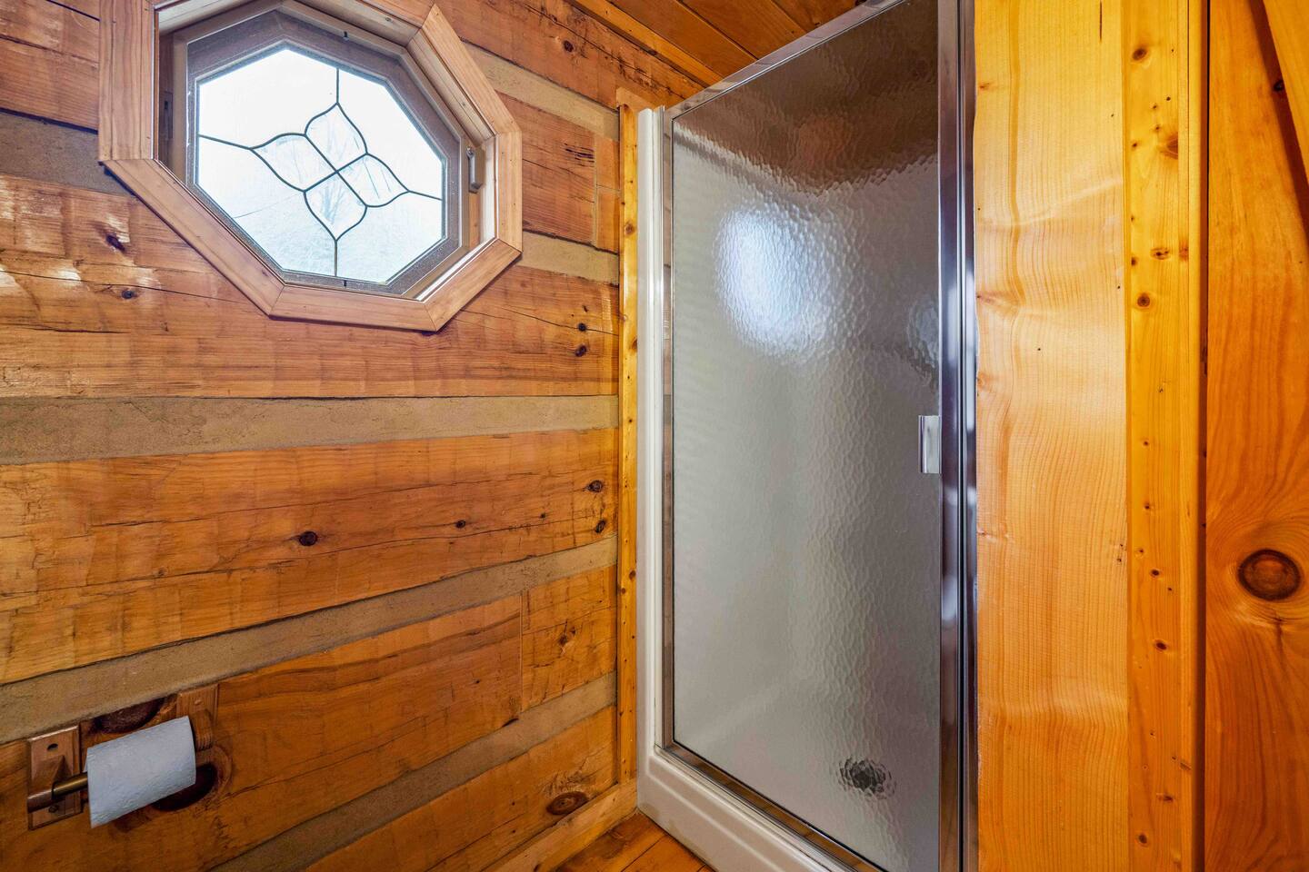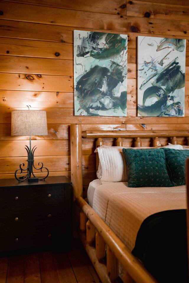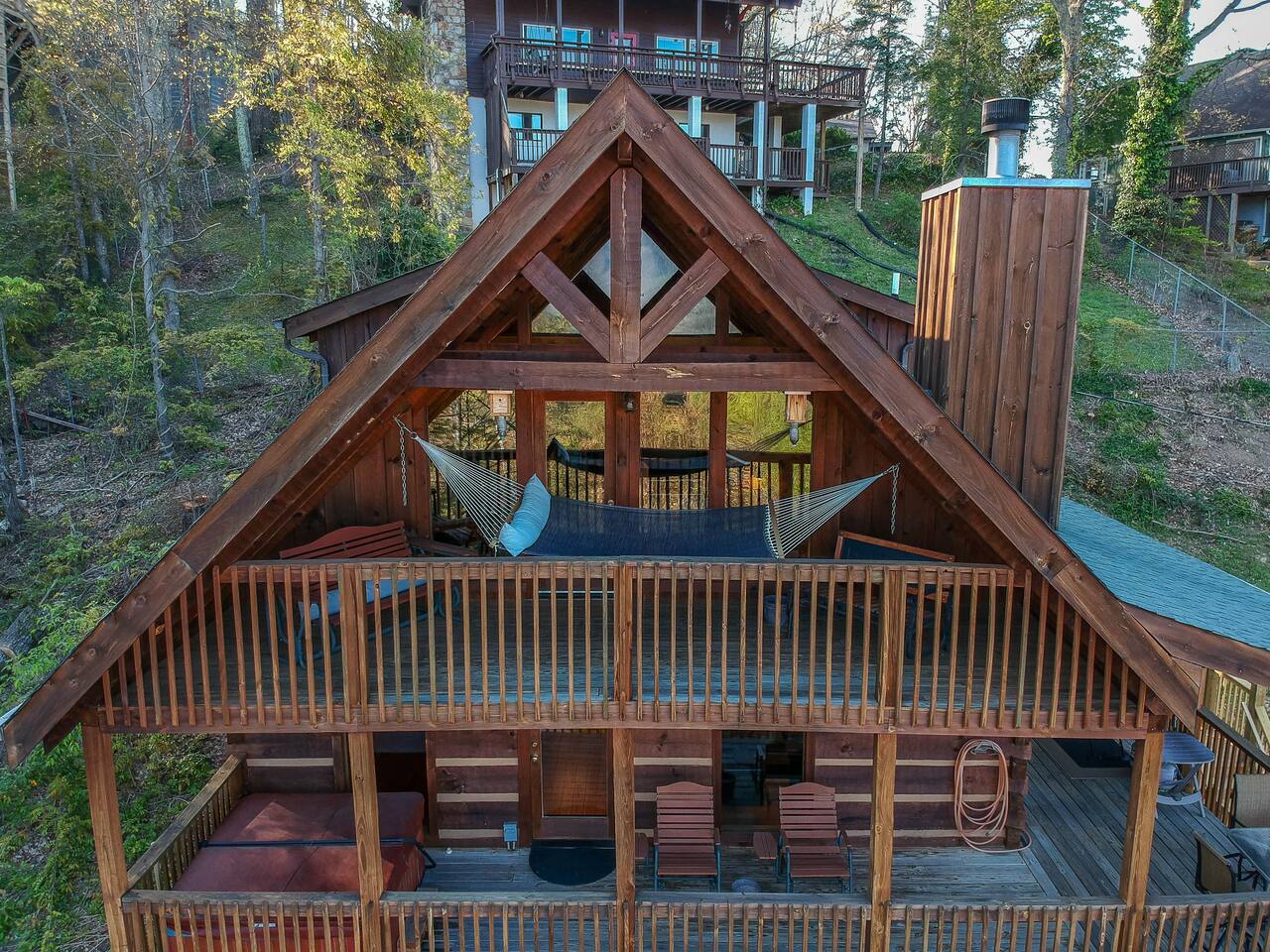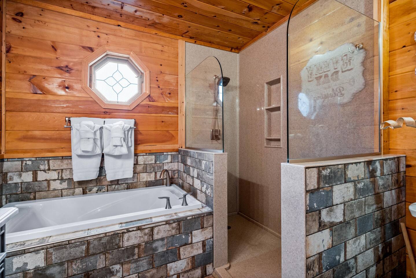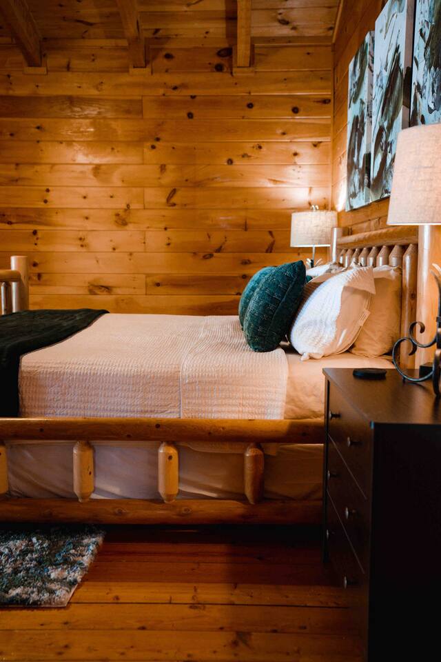 After a day of activities, the upstairs loft bedroom with its comfortable king size bed will lull you into dreamland. The bedroom includes a smart tv and an en-suite bath with a walk-in shower, large vanity, and a soaking tub. The bedroom has a catwalk that overlooks the great room and leads to the deck equipped with glider rocker benches and a hammock.