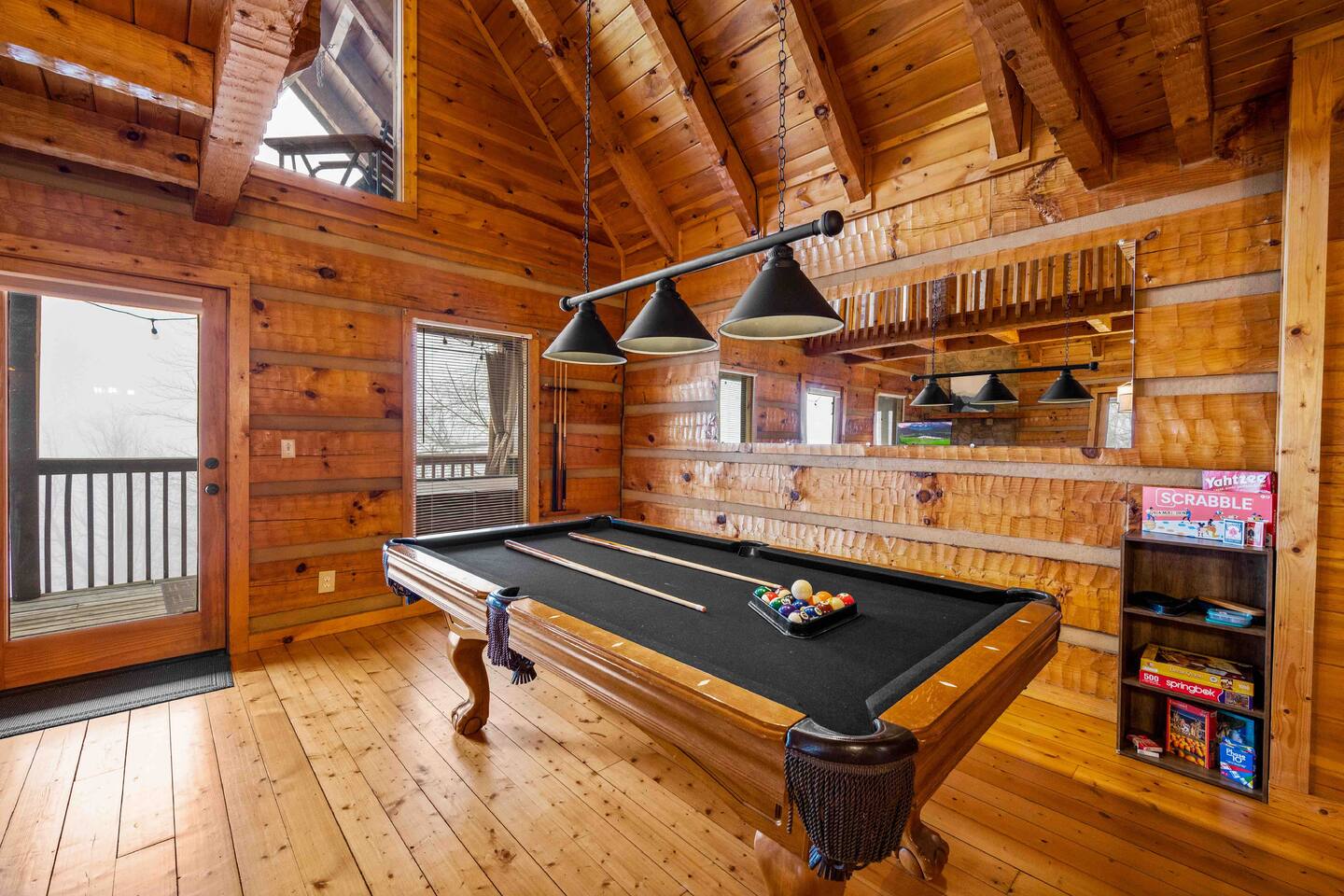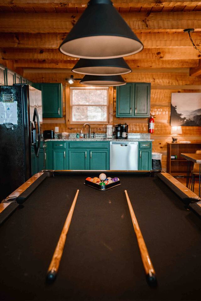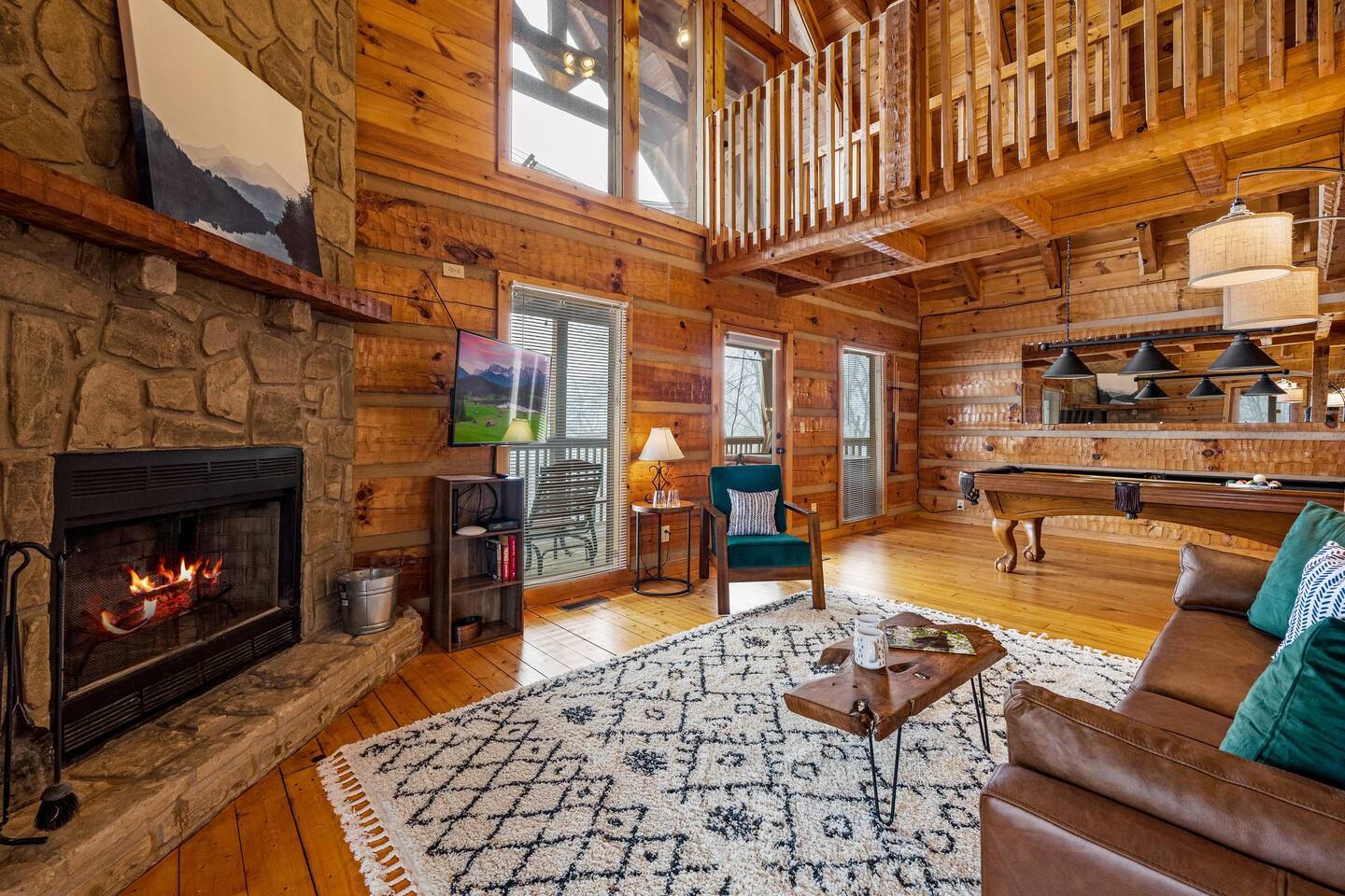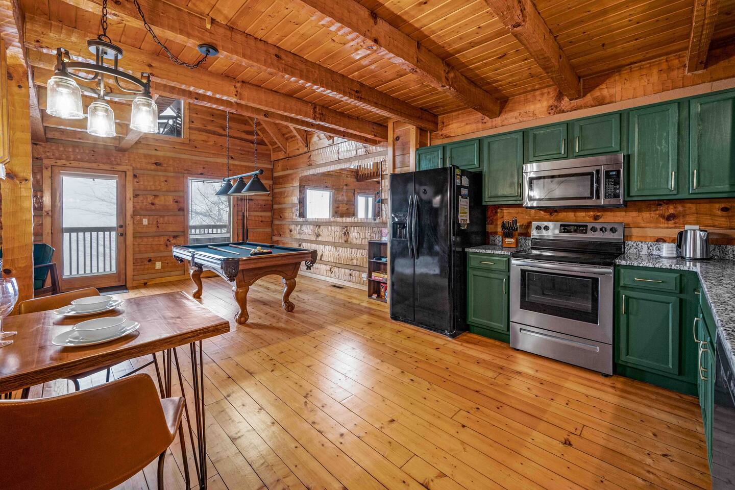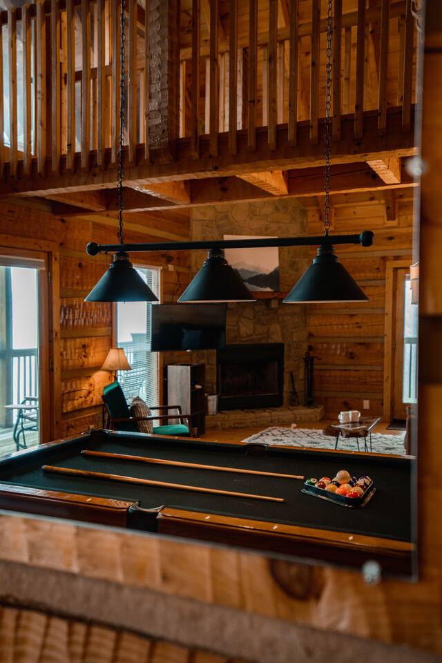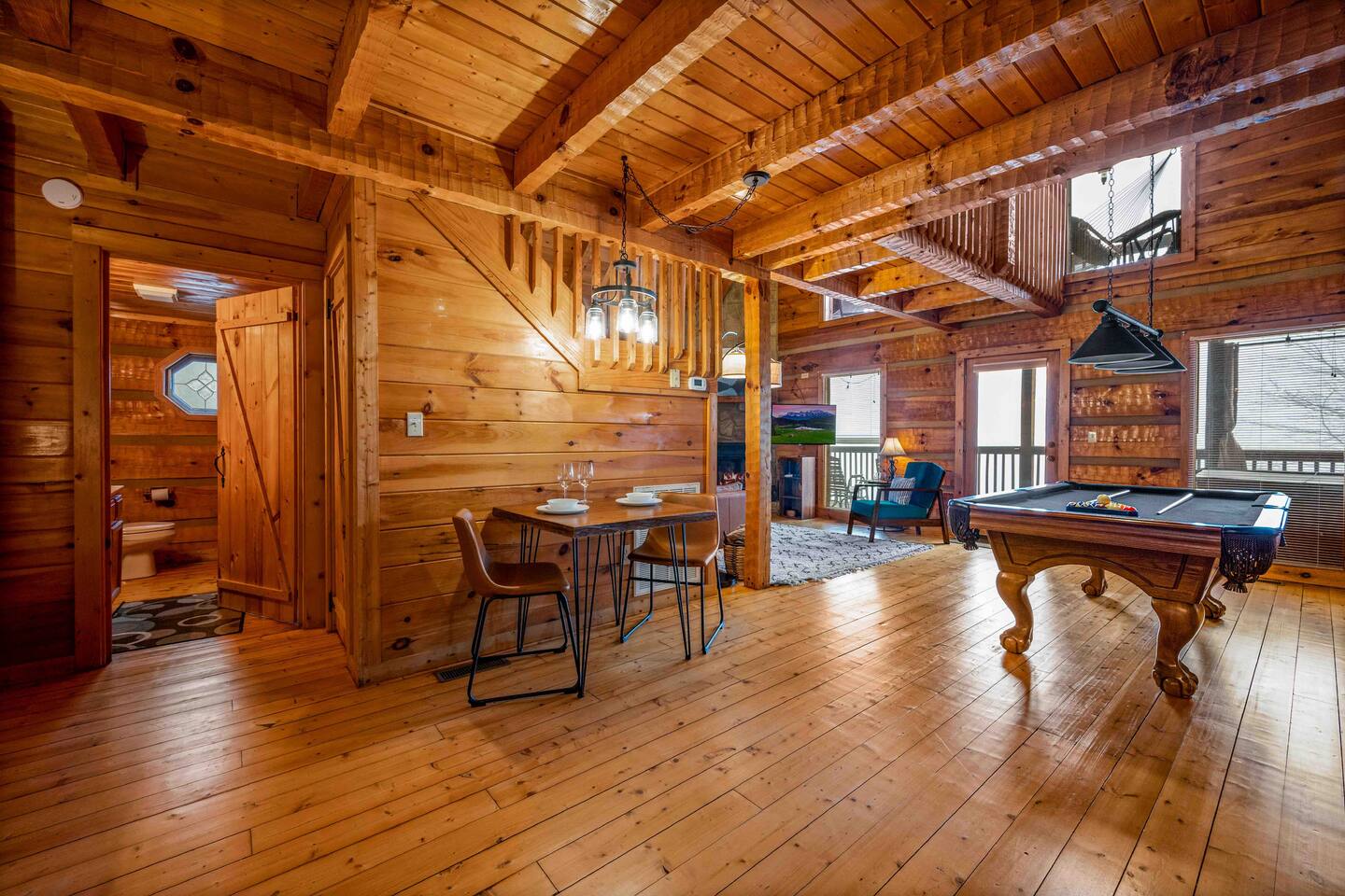 You will be awed by vaulted great room with the wonderful view, corner wood burning fireplace, a great interior and peaceful atmosphere. The rough hewn beams, log and chinking add to the total Smoky Mountains country aura of this log cabin. You will want to stop, sit a while, and just bask in the beauty and warmth of your surroundings, and look out the window at the spectacular view! The living room has a smart tv and Blu-ray DVD provided. Adjacent to the living room is a full size pool table ready for you to test your skill and challenge your partner. At night, you can stargaze from the hammock on the upper deck or experience true mountain romance as you and your companion relax in the hot tub while admiring the beautiful mountains of East Tennessee.