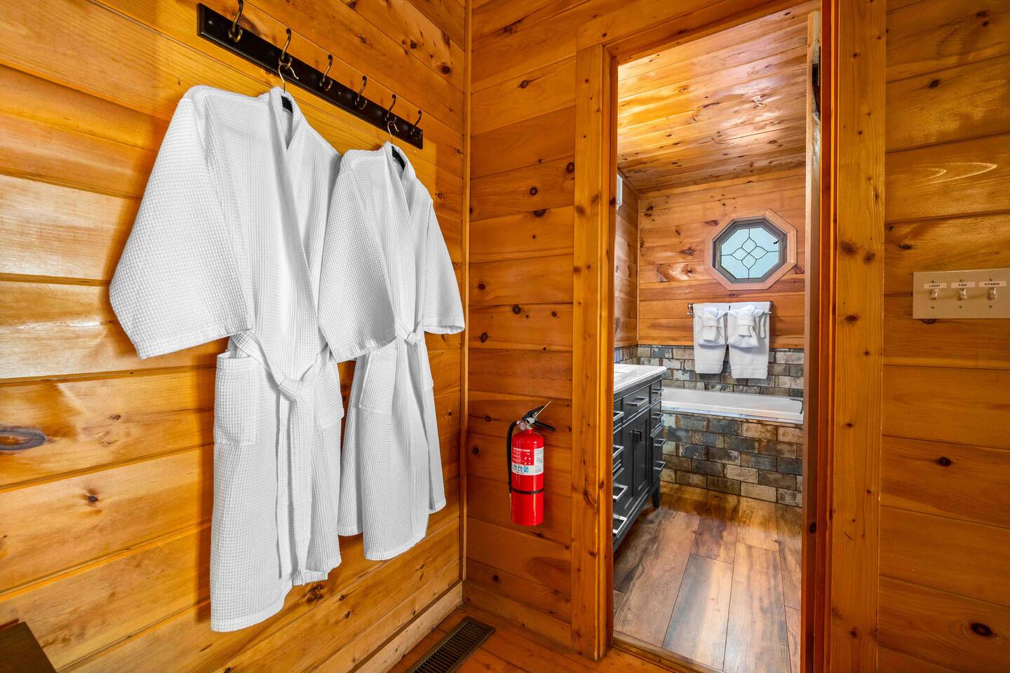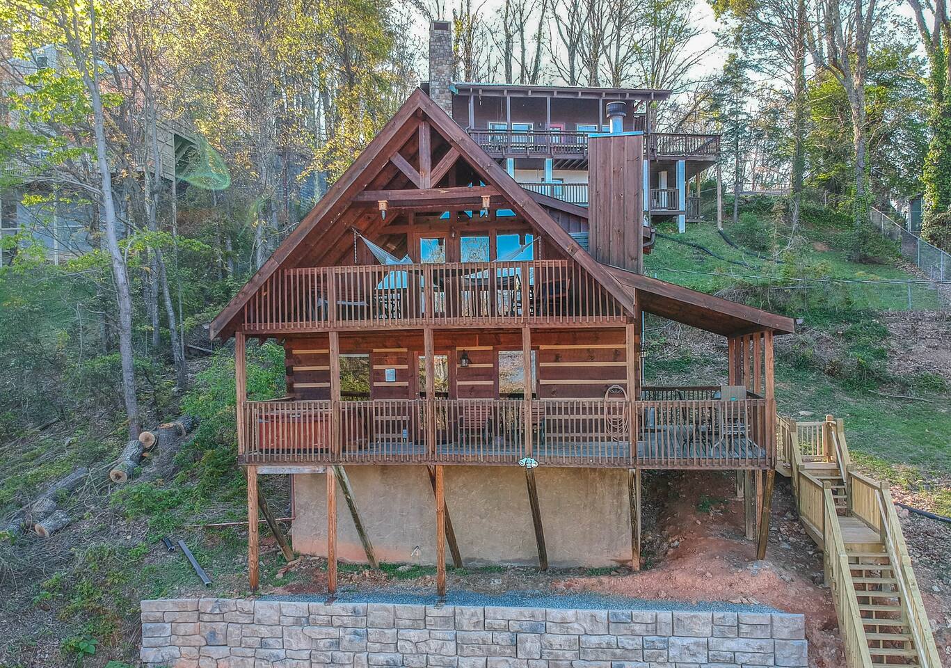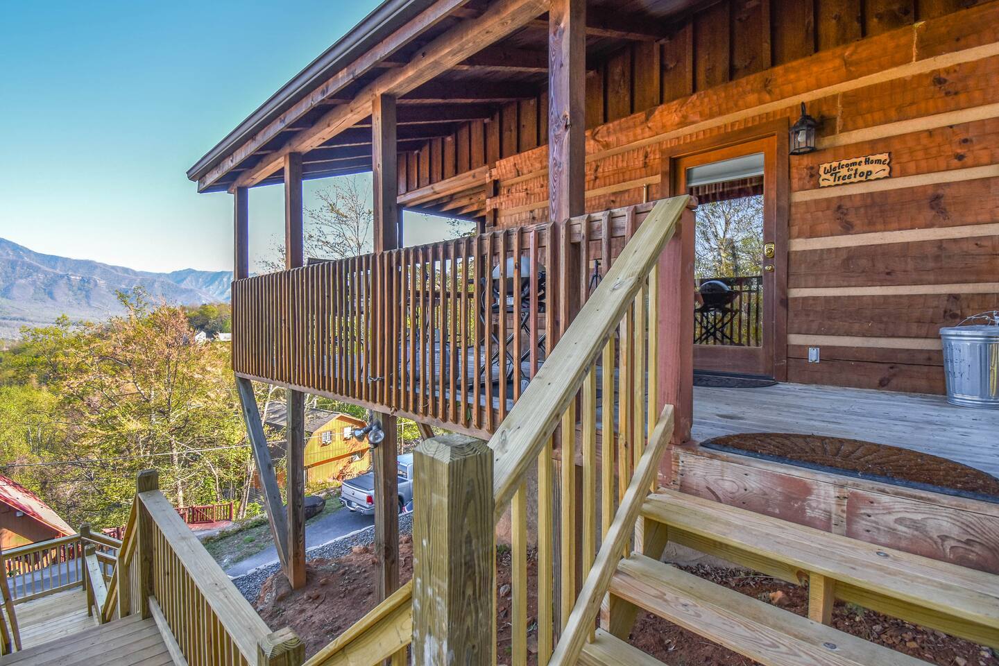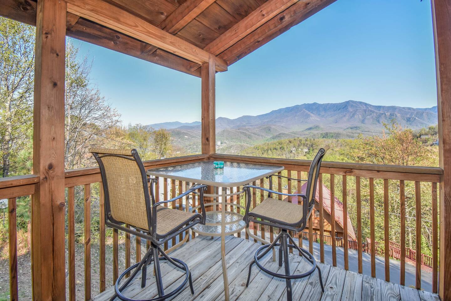 As you ascend the stairway to your luxury log cabin in the Smokies, you will feel as if you are ascending the 'Stairway to Heaven'. Heaven awaits you up top with a wrap around deck that has a hot tub and bar height table with chairs for dining alfresco under the stars, a charcoal grill for grilling those perfect steaks, burgers, and chicken.